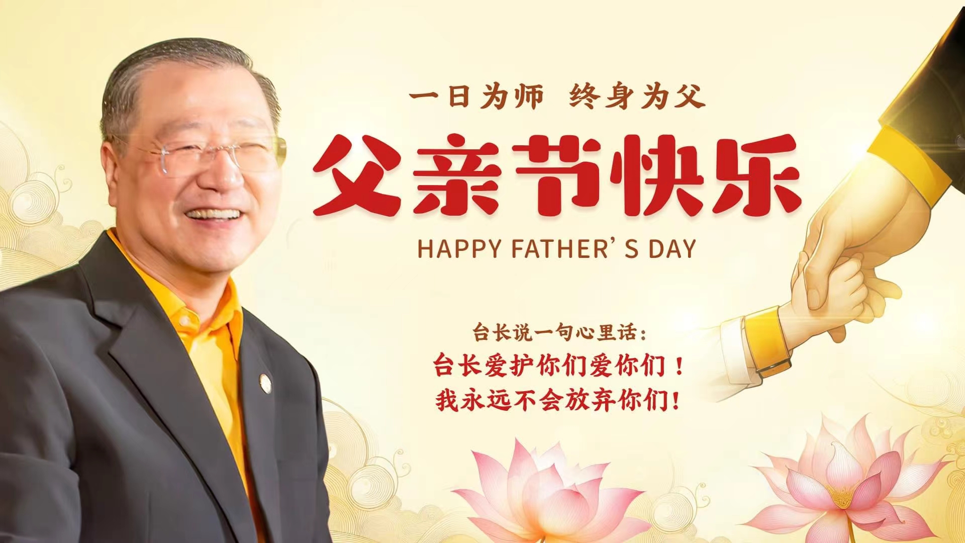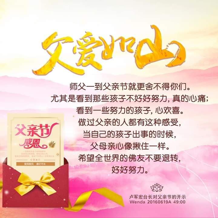 台长答:今天父亲节非常开心。祝天下所有的父母亲都能够健康、幸福。希望有慈悲心的人,不要因为父亲节就对父亲好,平时也要对父亲好;不要因为母亲节就对母亲好,平时也要对母亲好。那才是真正的大孝(师父一直教导我们一定要孝敬好父母,要孝顺)对,这也是我们学佛人的基础之一。